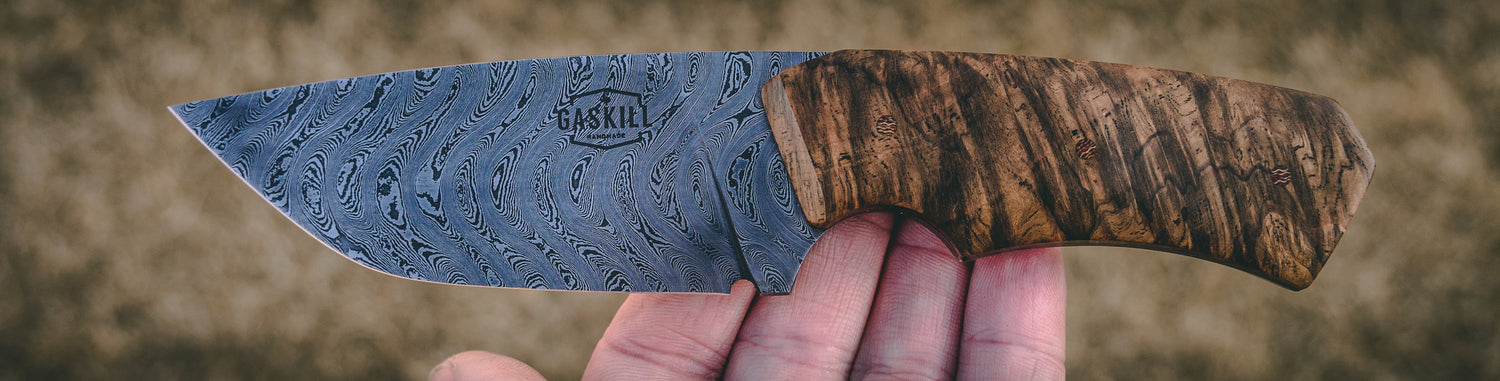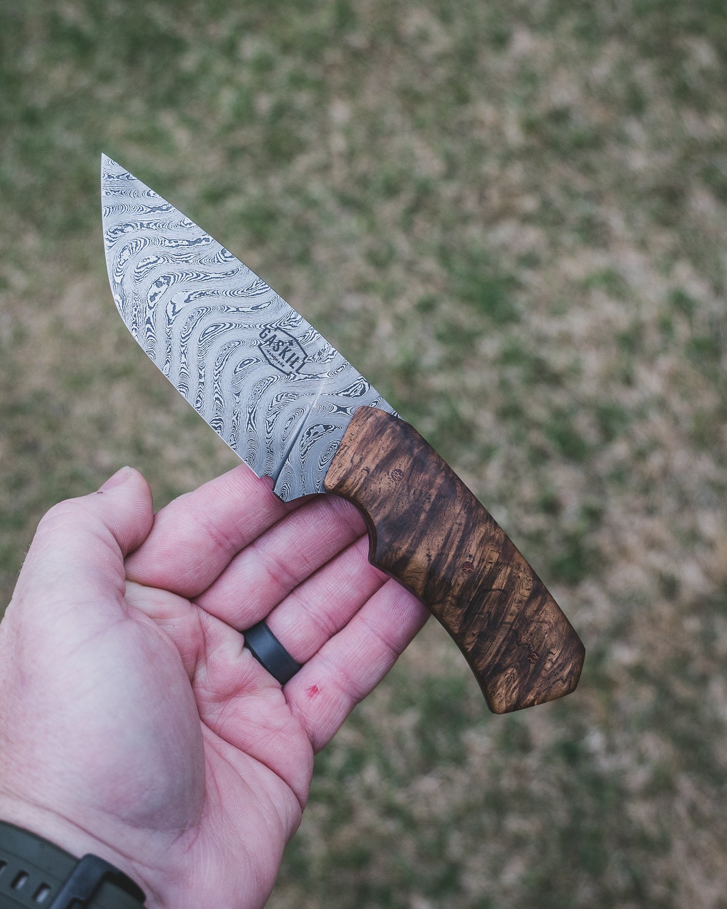 Damascus steel, spalted oak burl and hybrid leather sheath.