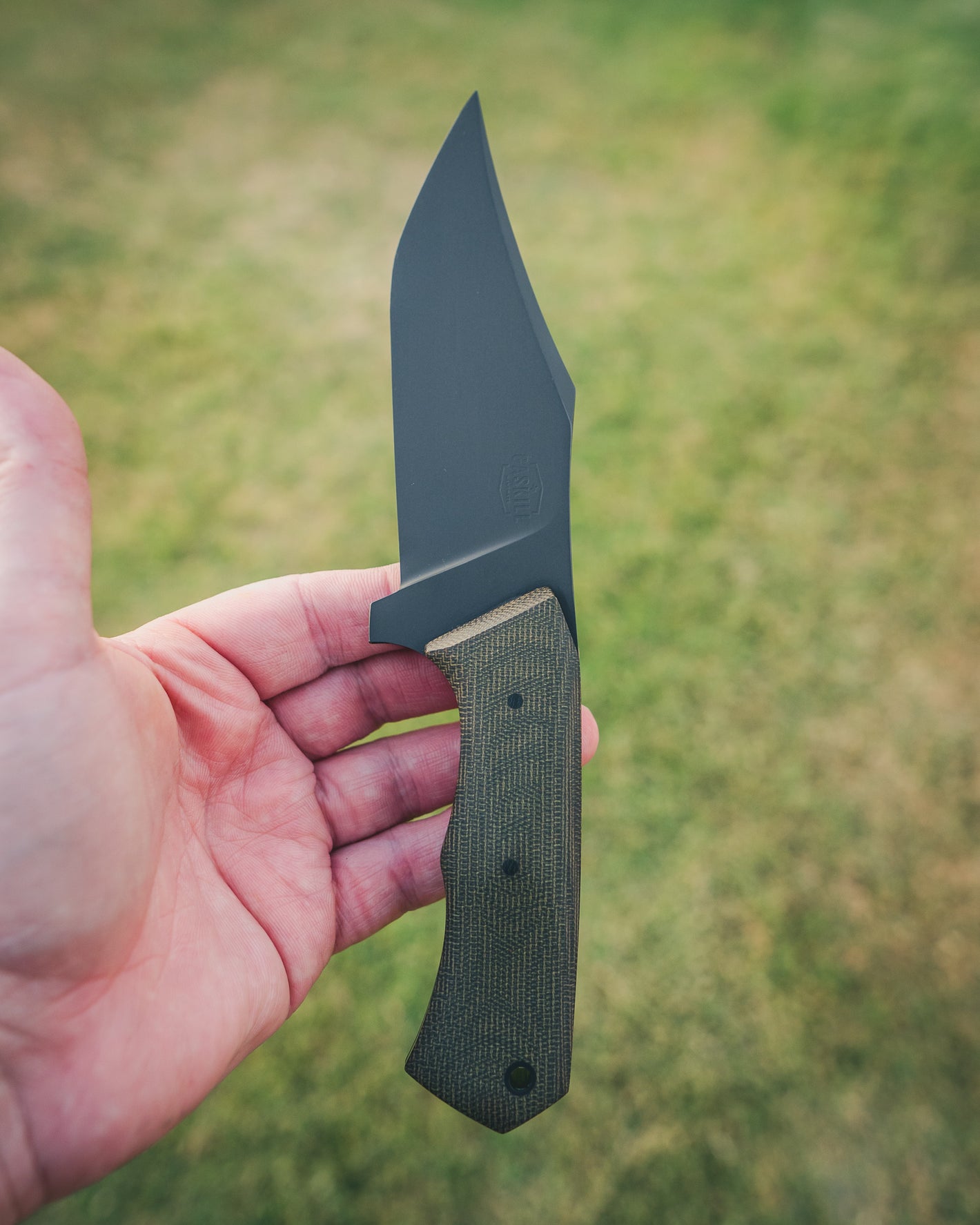 Parkerized 80crV2 steel, OD green canvas micarta scales, G10 liners and hybrid Sheath